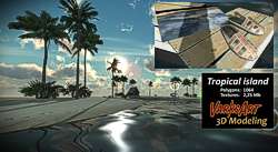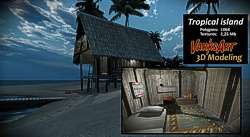 terrain, bungalow, bungalow interior, palms, bushes, pier, umbrella,